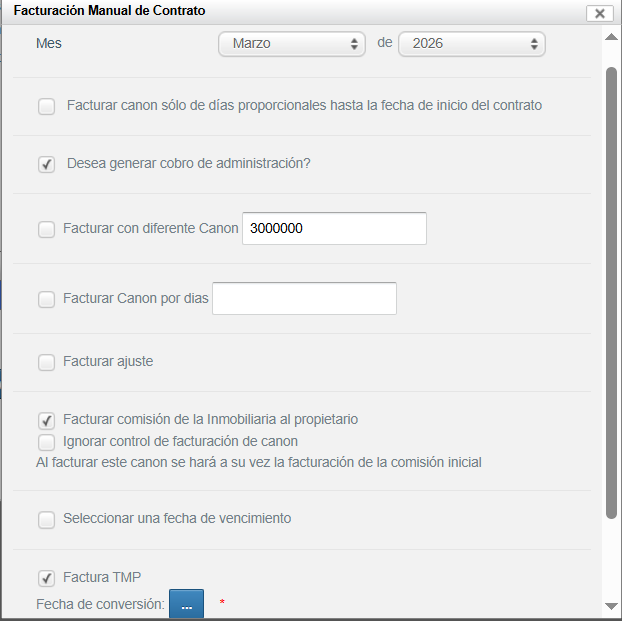 - Si se va a facturar el mes completo, se selecciona el mes a facturar, si la fecha de la primera factura es después de la fecha de inicio del contrato se cobrarán los días de ocupación.