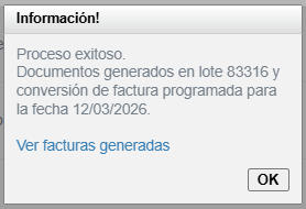 - Al terminar el proceso saldrá un mensaje indicando que se ha finalizado con éxito, número de lote y la opción ver facturas generadas, esta opción te direccionara a los movimientos de la factura.