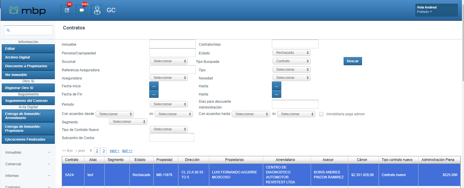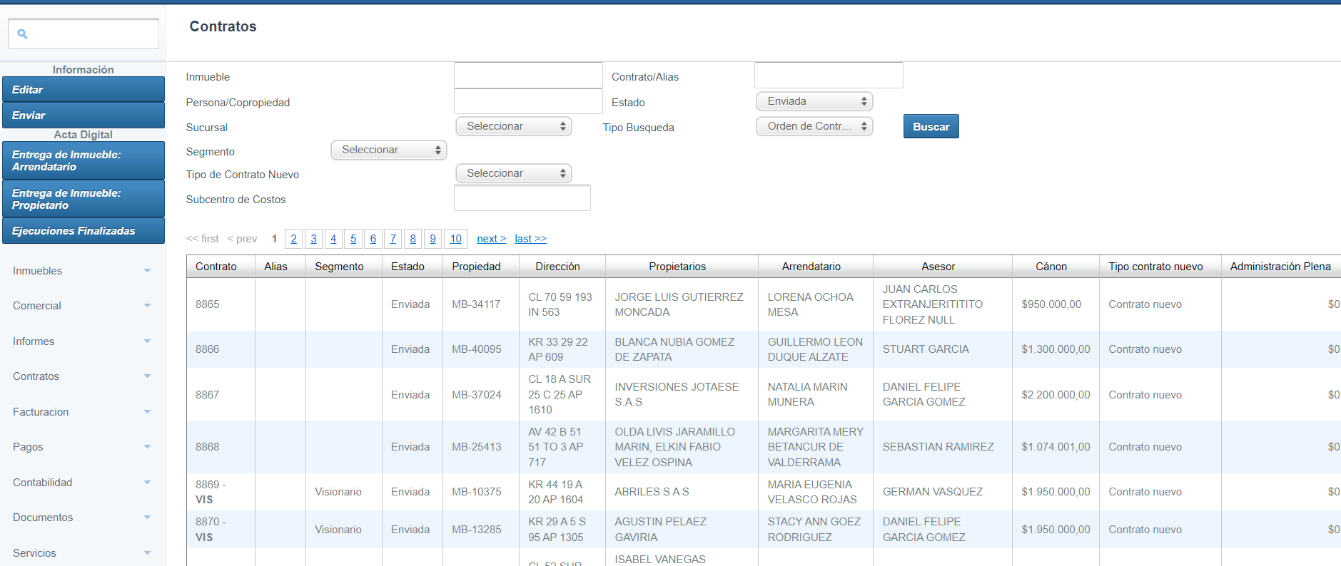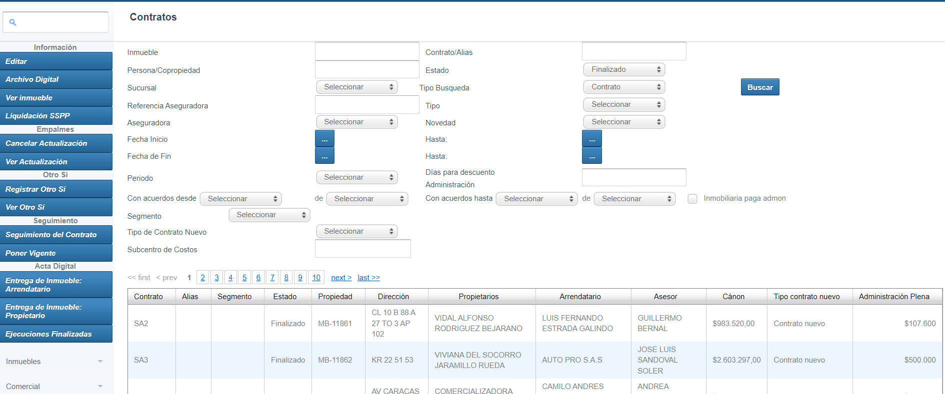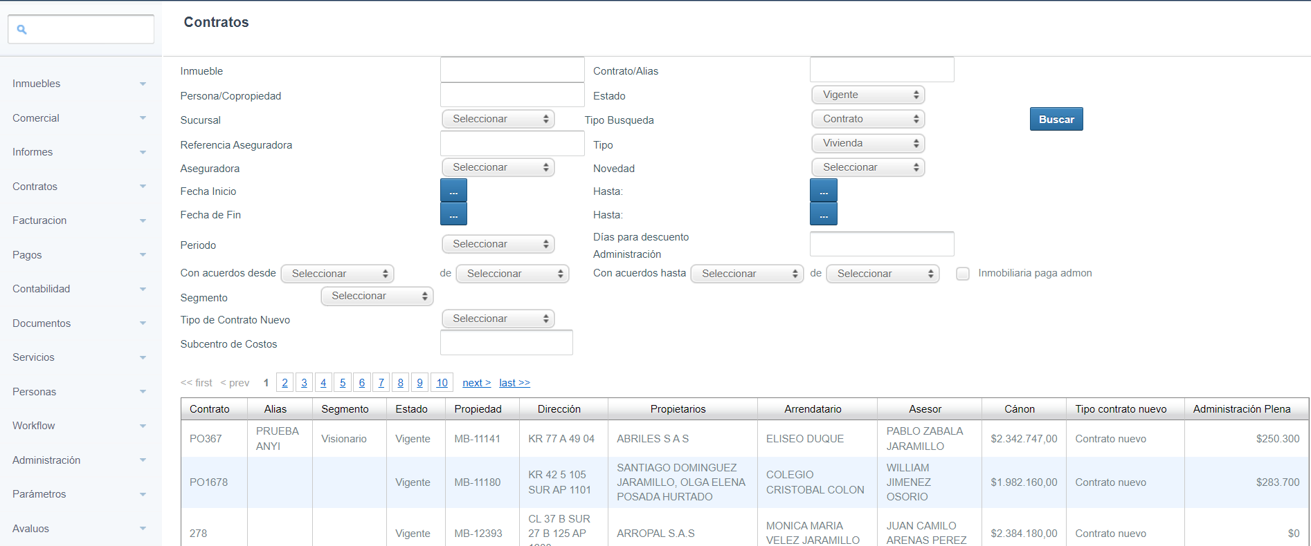 Esta opción permite consultar los contratos de la inmobiliaria y nos presenta varios filtros de búsqueda.