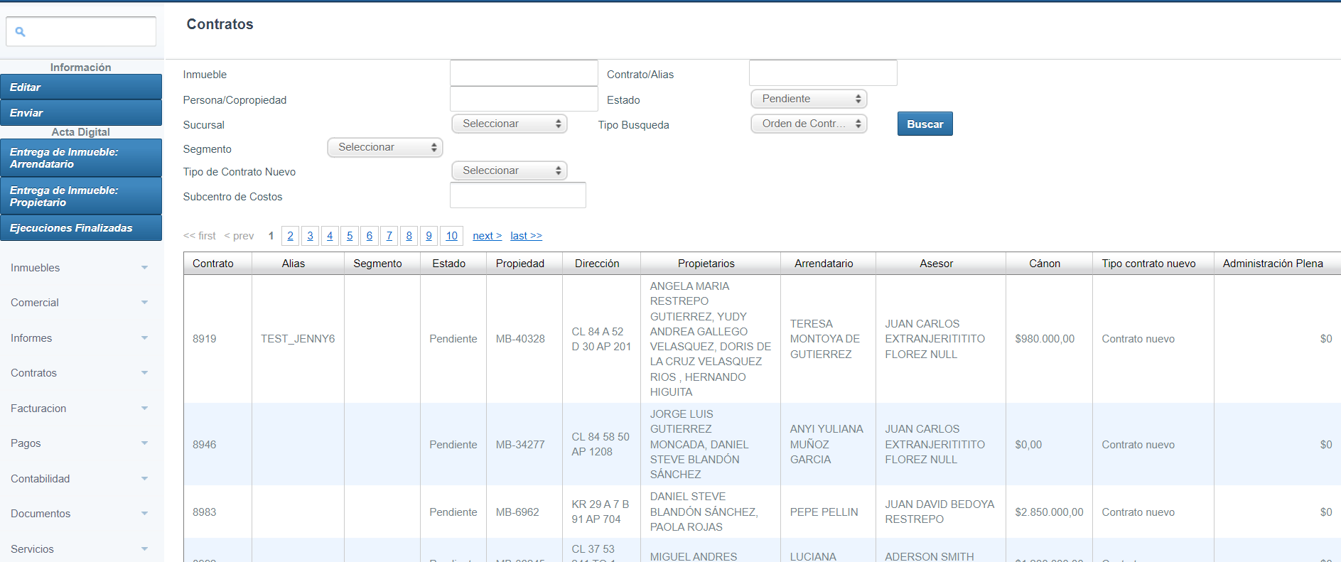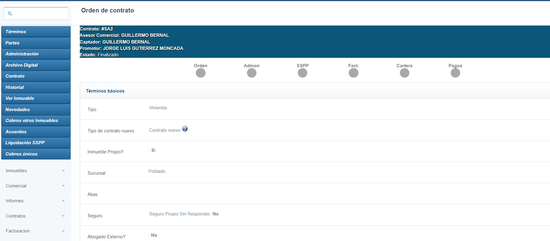 Al seleccionar en cualquier estado el número de contrato/Buscar permite verificar: Términos, Partes, Pago, Administración, Archivo digital, Descuento a propietarios, Contrato, Firma electrónica,Historial, Ver inmueble, Novedades, Cobros otros inmuebles, acuerdos, liquidación de servicios públicos, Cobros únicos y Otro sí.