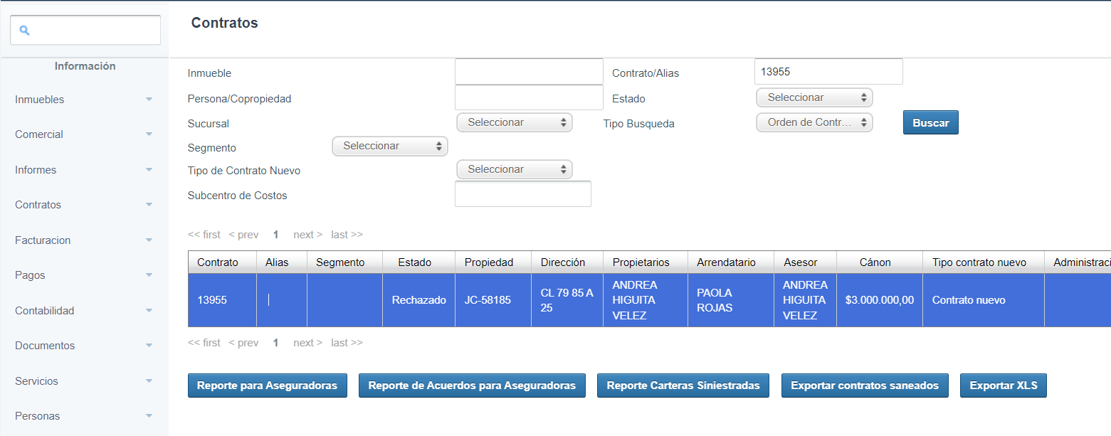 Persona/copropiedad: Permite realizar la búsqueda por las partes asociadas al contrato, sea propietario, arrendatario, deudores solidarios o copropiedad