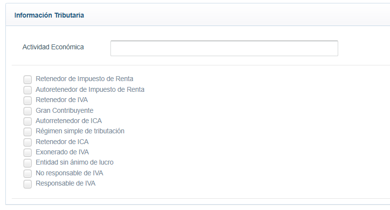 En este campo se seleccionan las responsabilidades fiscales, que se verán reflejadas en los procesos de facturación. (Obligatorio para propietarios, inquilinos, copropiedades, contratistas, y proveedores)