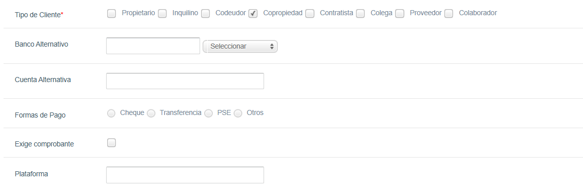 Tipo de cliente: propietario, inquilino, codeudor, Copropiedad, contratista, colega, proveedor, colaborados, este campo es obligatorio y traerá la información relevante para cada tipo de cliente o usuario .