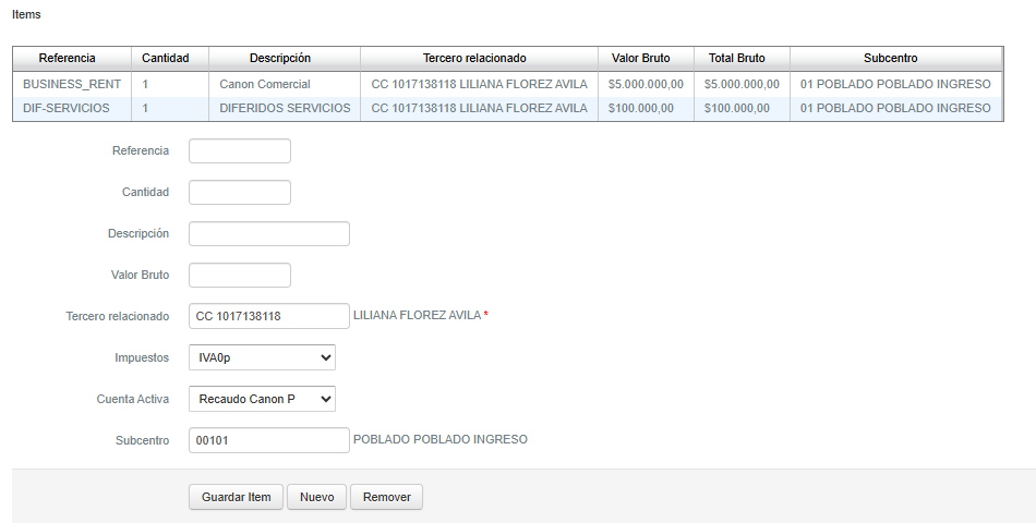 Despues de Diligenciar el encabezado se registran los items del documento: