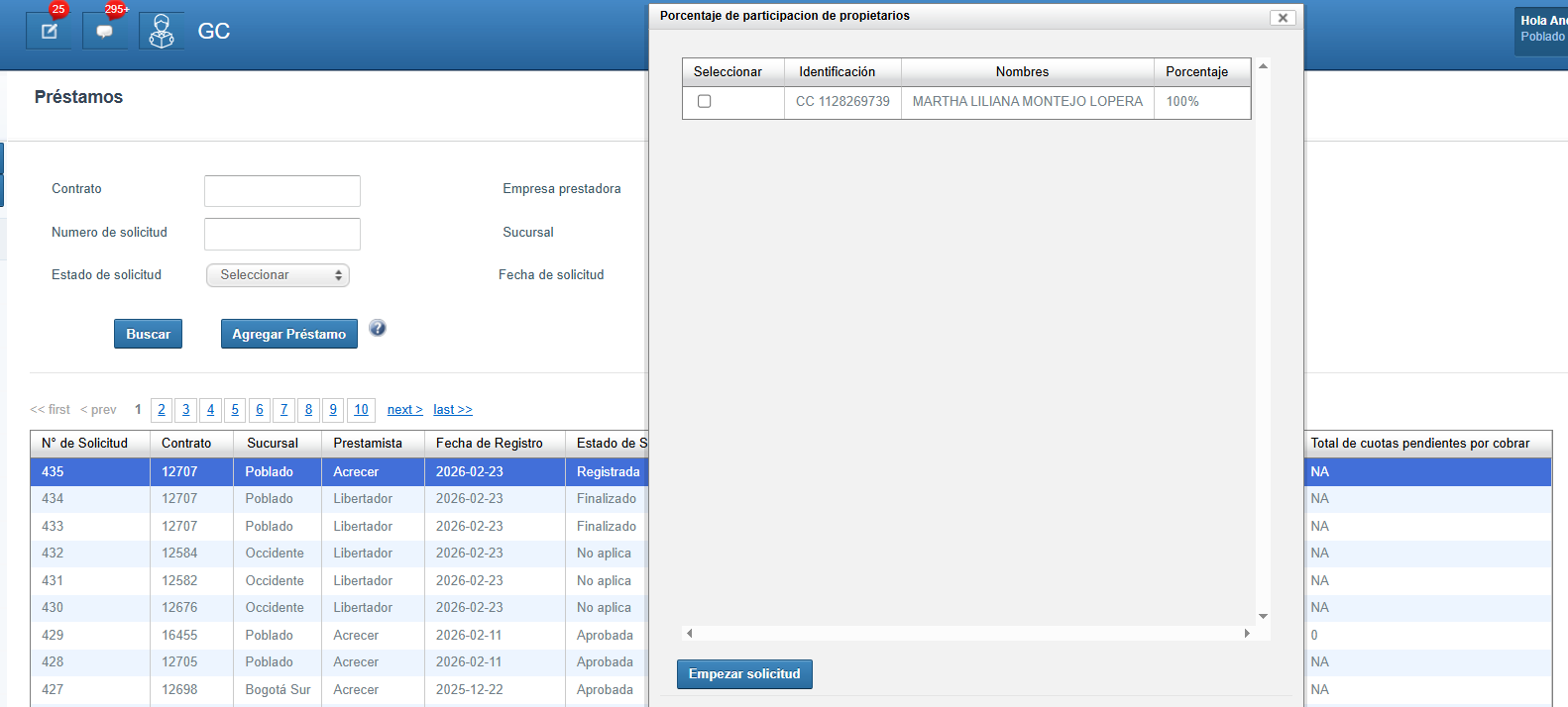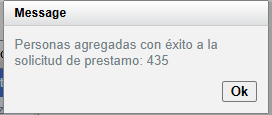 - Al seleccionar el propietario y dar clic en Empezar solicitud, sale un mensaje de confirmación indicando "Persona agregada con éxito a la solicitud de prestamos: XXXX"