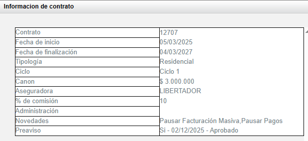 - Información contrato: Despliega una ventana emergente con información básica del contrato
