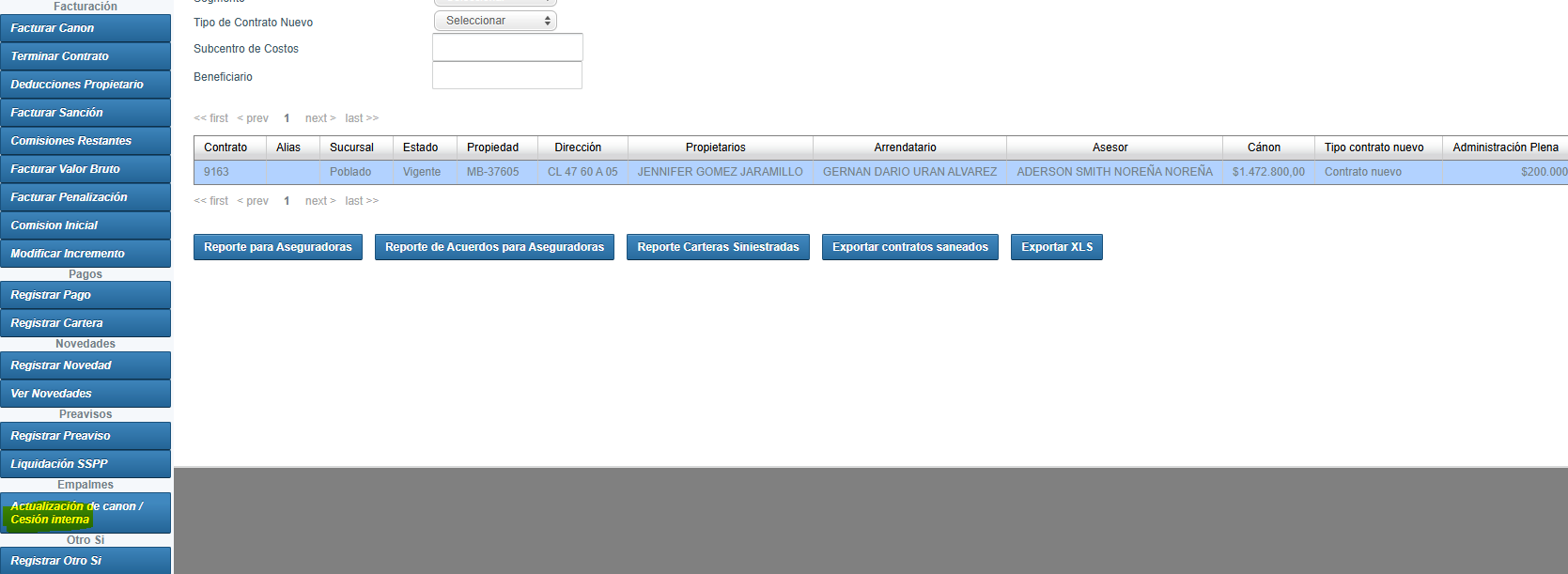 Esta opción que nos brinda el sistema en contratos, nos permite realizar el cambio de propietario por venta del inmueble, entendiendo que en este caso se debe realizar un nuevo contrato por empalme a solicitud del propietario.