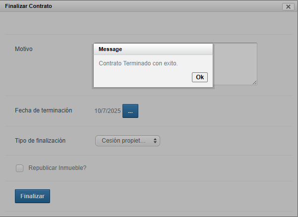 - En este punto se debe gestionar la terminación del contrato anterior que queda en estado En Cesión para Liberar la propiedad para el nuevo contrato ya que el sistema no permite que se tengan 2 contratos en estado Vigente, el motivo de la finalización debe ser Cesión propietario.