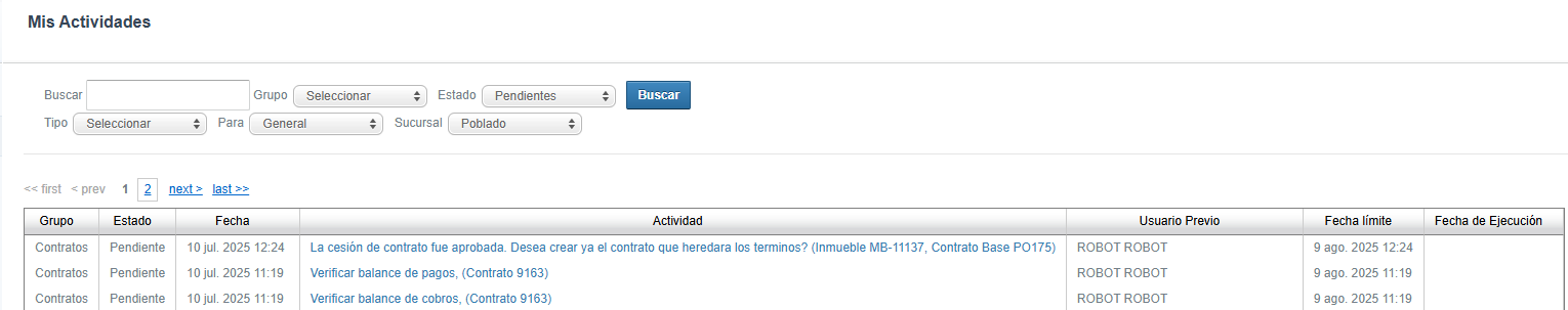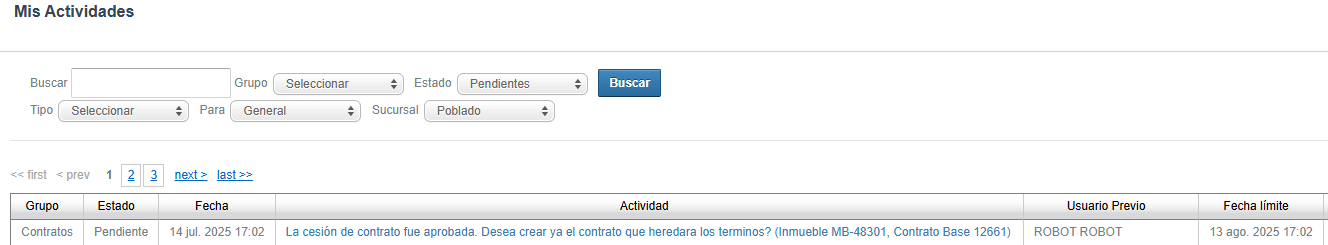 - Al usuario le llega una actividad "La Cesión fue aprobada. Desea crear ya el contrato que heredará los términos? (Inmueble xxxxx, Contrato Base xxxxx)