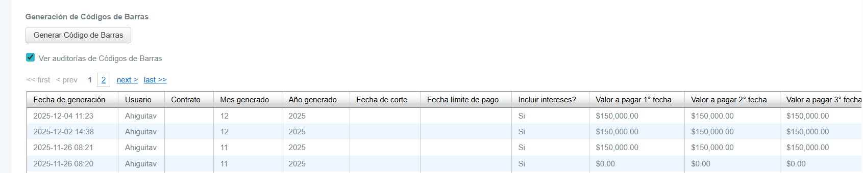 - Seleccionar el Contrato del cual se va a generar el código de barras