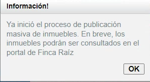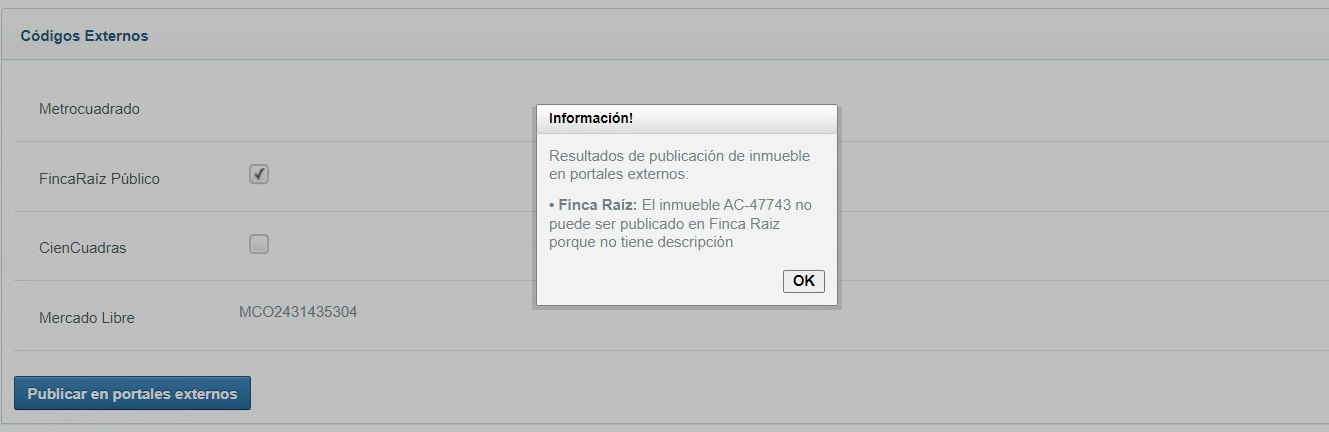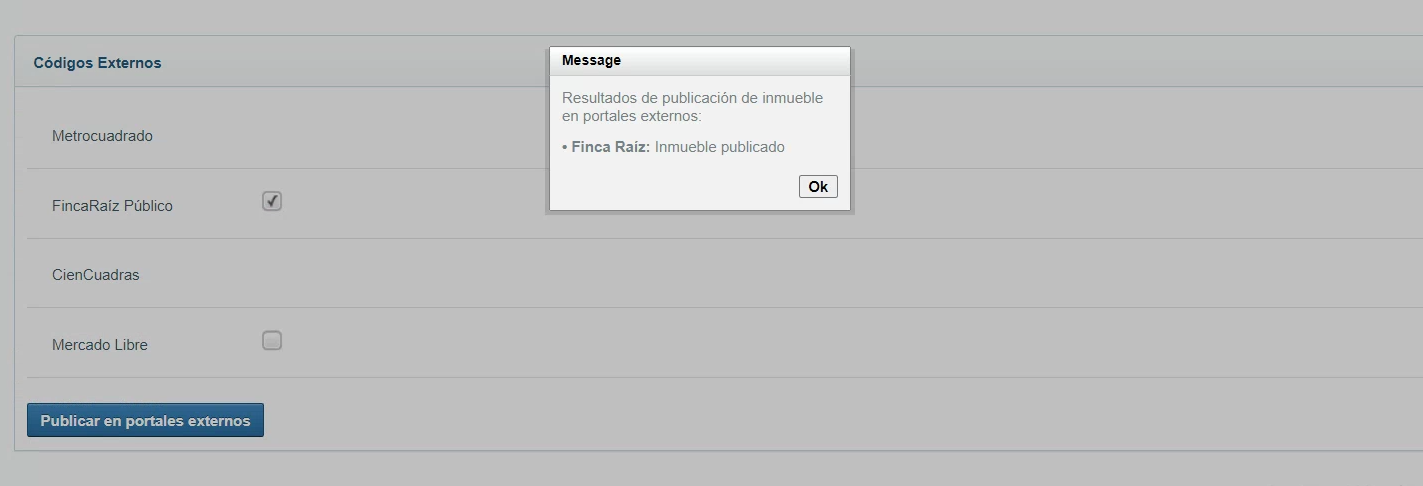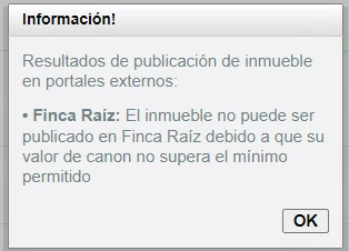 Una vez marcada la opción Finca Raíz, se debe presionar el botón “Publicar en portales externos“, en donde se mostrará, mediante un aviso emergente o popUp, el resultado de la publicación. Los posibles resultados son: