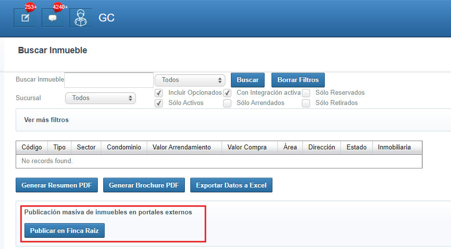 La publicación masiva de inmuebles en Finca Raíz se hace desde la ruta inmuebles/inmuebles, en donde se encuentra en la parte inferior de la vista una sección desplegable con un botón que permitirá realizar esta acción: