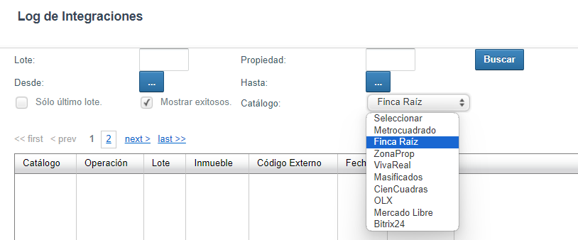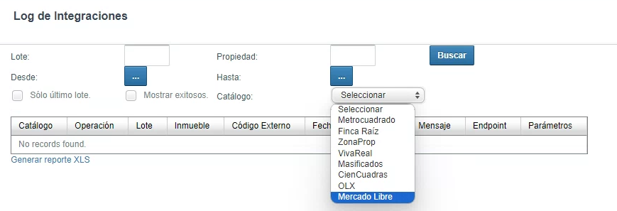Los resultados de las peticiones enviadas para publicar un inmueble en el portal se pueden consultar desde la vista Parámetros/Integraciones, en donde se deben aplicar los filtros necesarios para consultar la información del inmueble y del portal deseado. A continuación se muestran las opciones disponibles para el filtro de búsqueda: