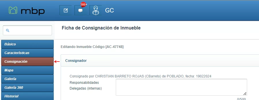 Para publicar un inmueble, se debe buscar un inmueble activo (que se encuentre en venta o en arriendo) desde la ruta inmuebles/inmuebles en Mobilia. Tras obtener los resultados de la búsqueda, se debe seleccionar alguno, y navegar hacia la vista de consignación, señalada a continuación: