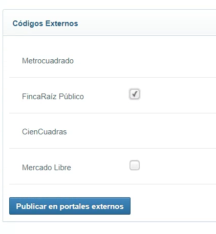 Al final de esta página, se encuentra la sección titulada “Códigos Externos”. En esta, es posible encontrar un checkbox mediante el cual señalar el portal externo en el que se desea publicar el inmueble, en este caso, Finca Raíz: