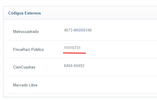 Una vez el inmueble se encuentre publicado en el portal, se le asignará un código (dado por Finca Raíz) que será visible en lugar del checkbox utilizado previamente para publicarlo, en la sección de Códigos Externos de la vista de consignación del inmueble: