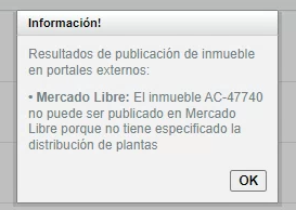 Una vez marcada la opción Mercado Libre, se debe presionar el botón “Publicar en portales externos“, en donde se mostrará, mediante un aviso emergente o popUp, el resultado de la publicación. Los posibles resultados son:
