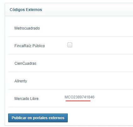 Una vez el inmueble se encuentre publicado en el portal, se le asignará un código (dado por Mercado Libre) que será visible en lugar del checkbox utilizado previamente para publicarlo, en la sección de Códigos Externos de la vista de consignación del inmueble:
