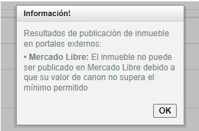 Si un inmueble se encuentra publicado en un portal, y su valor de canon de arrendamiento es actualizado, de modo que el nuevo valor quede por debajo del mínimo establecido en la sucursal a la que pertenece, entonces automáticamente el inmueble será eliminado del portal de Mercado Libre, y su código externo será eliminado.