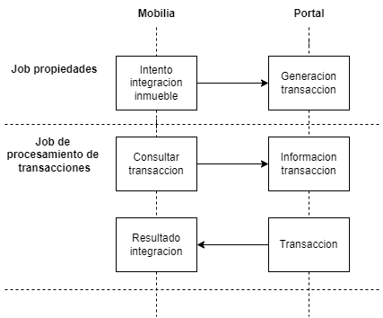Un intento de integracion genera una transacción. Esta transacción debe consultarse al portal para conocer el resultado de la integracion. De esta manera se puede tener la información al día del inmueble en el portal dentro de mobilia. Este procesamiento de sincronización lo realiza el job de transacciones de M2 (M2PropertiesTransactionsProcessingJob):