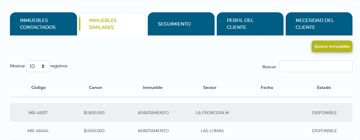 - Al ingresar a la información de gestión del cliente ubicar la pestaña Inmuebles similares