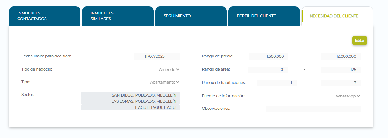 Si se requiere modificar la necesidades del cliente seleccionar la pestaña Necesidad del cliente, allí se puede modificar la información para hacer la búsqueda.