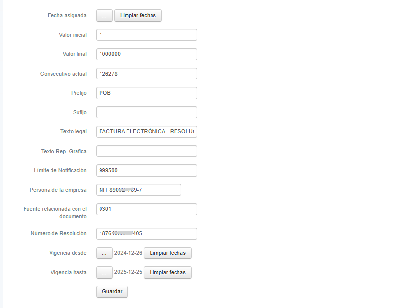 Numero de Resolución: Numero de documento (obligatorio)
