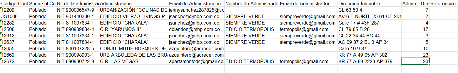 Información que puedes consultar en el reporte en el rango seleccionado de fechas: todos los contratos vigente con código del contrato, sucursal, nit de la administración, administración, Email de la admin, Nombre del administrador, Email del administrador, Dirección del inmueble, día descuento, referencia de pago, admin- cuota descuento, forma de pago, cuota plena, notas programadas, admon+cuota, admin telefono, valor de la administración anterior, fecha de ultima modificación, datos del beneficiario, estado del mes anterior, estado del mes actual, exige comprobante, seguimiento, descuento pronto pago.