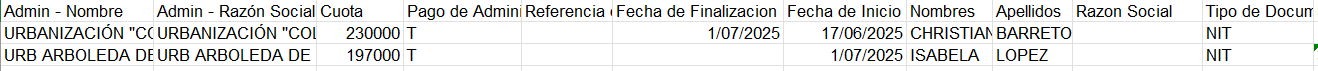 Información que puedes consultar en el reporte en el rango seleccionado de fechas: todos los contratos cuya fecha de inicio o finalización están dentro de las fechas de consulta y los con contrato, estado del contrato, sede, aseguradora, dirección, código, nit de la administración, Nombre de la administración, razón social, cuota, pago de administración, referencia, fecha de finalización, fecha de inicio, datos del beneficiario.
