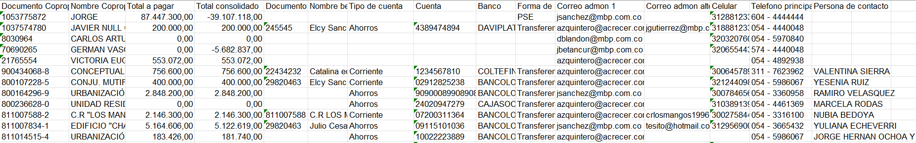Información que puedes consultar en el reporte en el rango seleccionado de fechas: documento de la copropiedad, nombre de la copropiedad, total a pagar, total consolidado, documento, nombre del beneficiario, tipo de cuenta, cuenta, banco, forma de pago, correo admon, celular, teléfono, persona de contacto