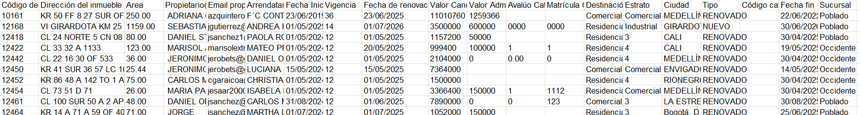 ¡A TENER EN CUENTA! La información del reporte depende de la información consignada en el inmueble y en el la orden de contrato si alguno de los datos no es diligenciado estos campo se pintaran en blanco o en 0 si el campo es obligatorio.