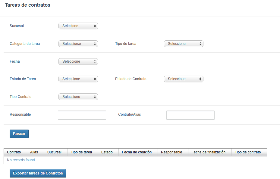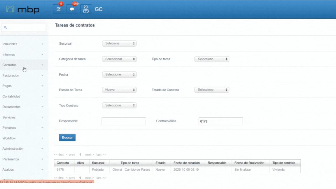 - Se ingresa a la ruta de tareas de contrato y se busca la tarea por medio de los filtros, ya se por contrato, fecha, estado, sucursal, categoría de la tarea...