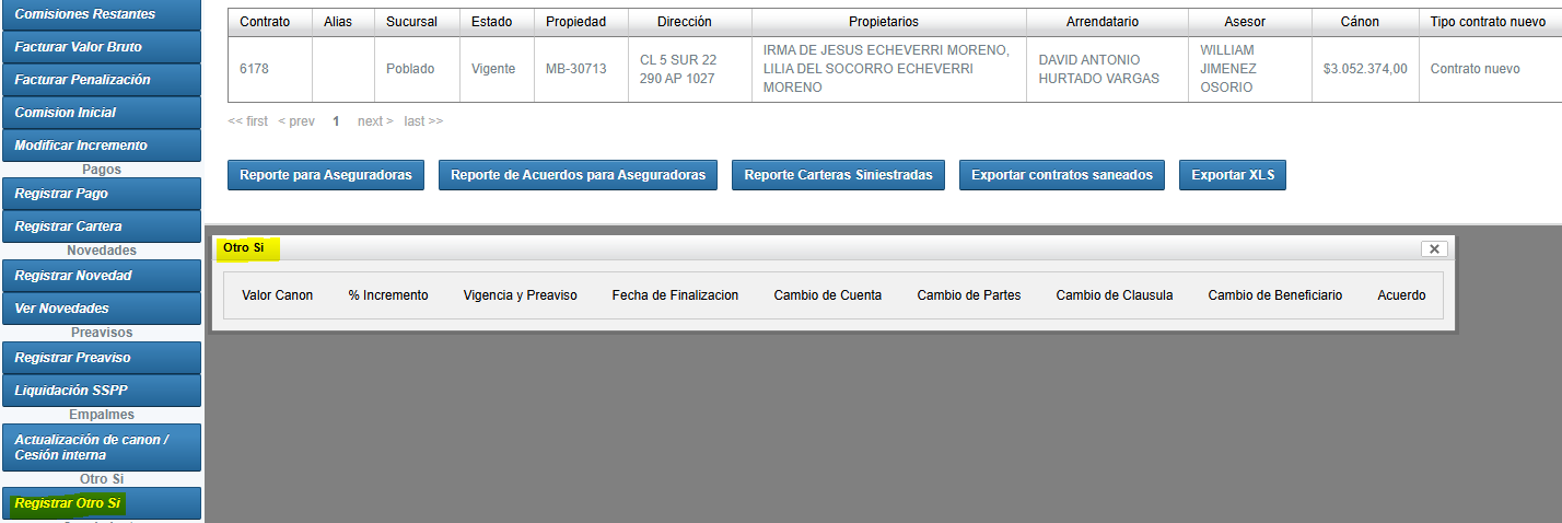 - Cambio de cuenta, Ingresar al contrato/Pagos/Seleccionando el propietario al que se le debe cambiar al beneficiario y realizar el cambio en el campo de cuenta.