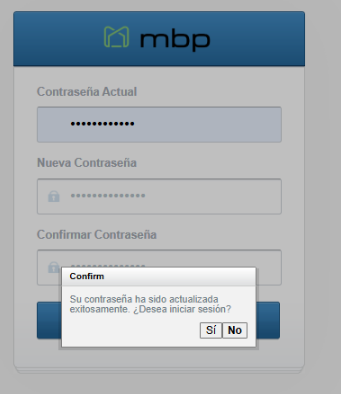 Finalmente después de crear la contraseña se emite un mensaje de confirmación "Su contraseña ha sido actualizada exitosamente ¿Desea iniciar sesión? Si- No